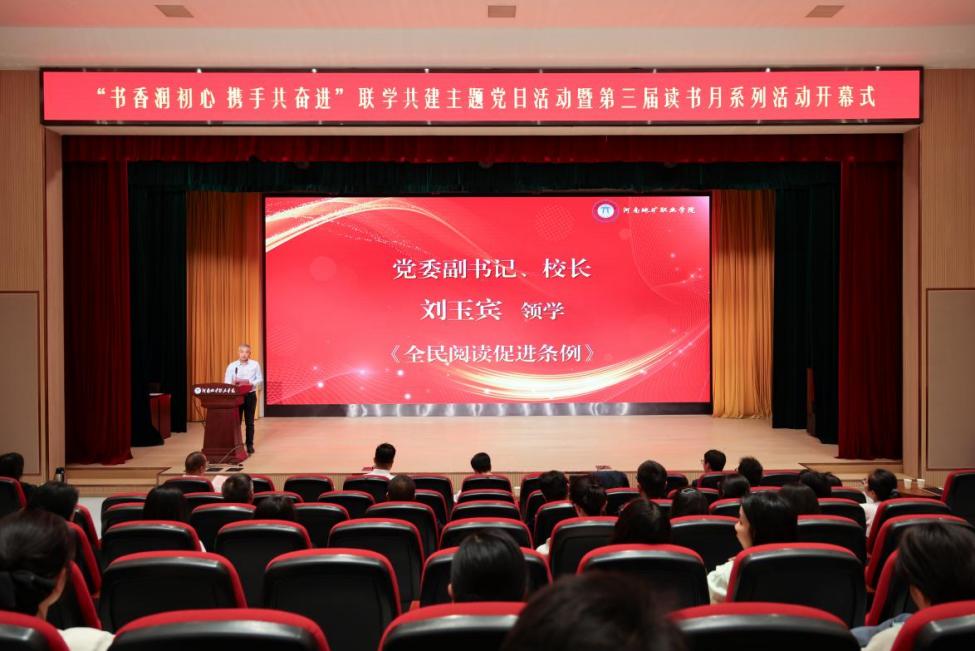 焦洪涛发表致辞,他指出,本次活动是党建引领、校企合作、书香建设深度融合的创新实践,希望全校师生以书润心、筑牢信仰,以读增智、锤炼本领,以学促干、携手奋进,让勤学好读成为校园鲜明标识。党委副书记、校长刘玉宾带领全体参会人员领学《全民阅读促进条例》,强调要以条例为遵循,将全民阅读融入教育教学全过程,营造持久浓厚的书香氛围。